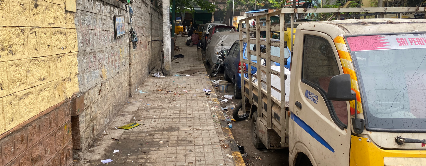 Footpaths are dirty, broken, and blocked by parked cars, and encroached by shops and vendors.