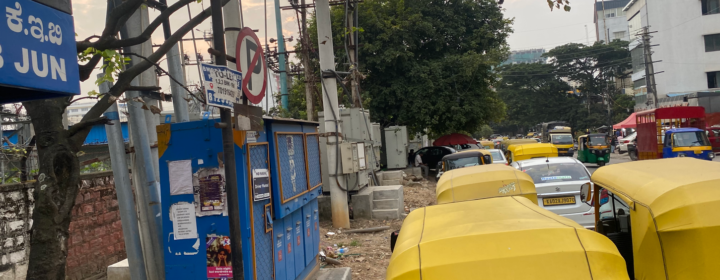 The footpath at 7th main to the bus stop is completely obstructed by electric utility structures and a public toilet. The shoulder space is also taken over, along with parked cars and autos. Walkers must wade through oncoming traffic to reach the junction.