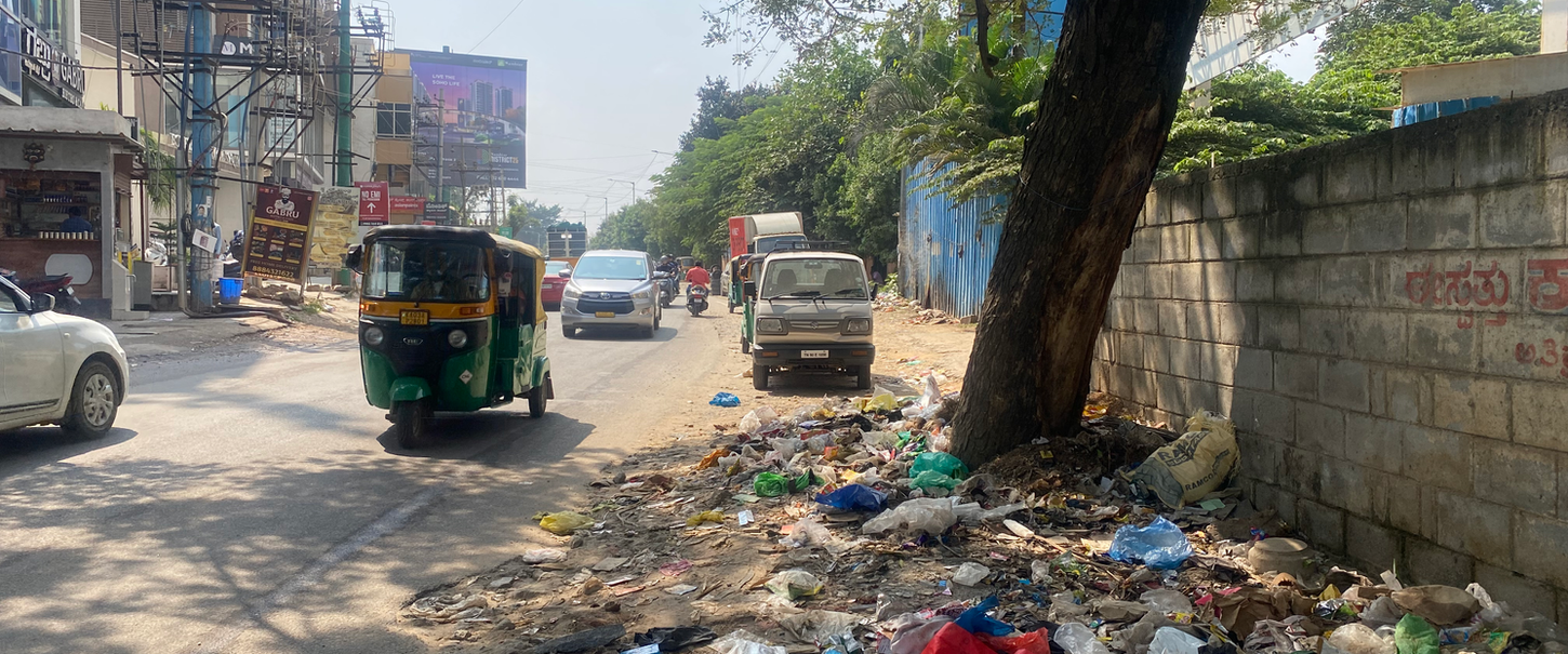 There is ample space for walkways, but footpaths are absent or broken along the road, and it is littered with garbage.
