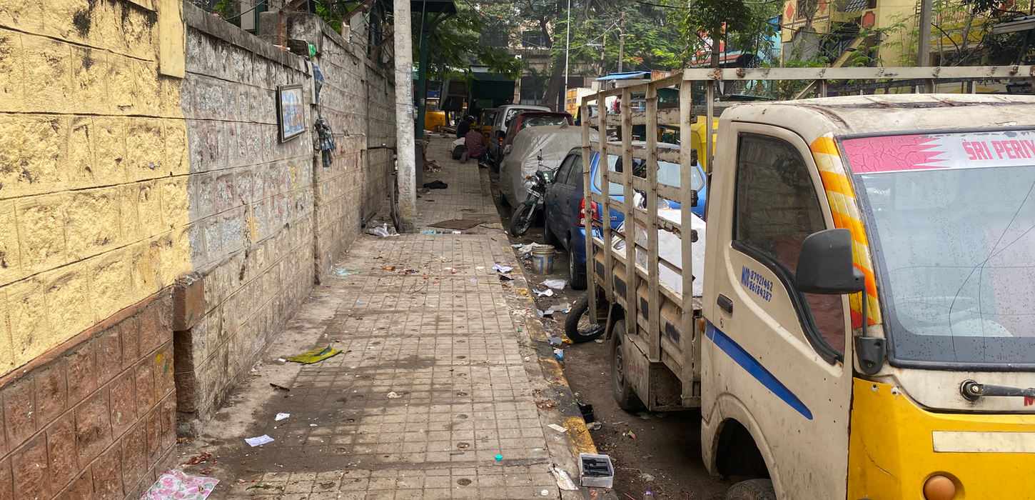 Footpaths are dirty, broken, and blocked by cars and vendors.