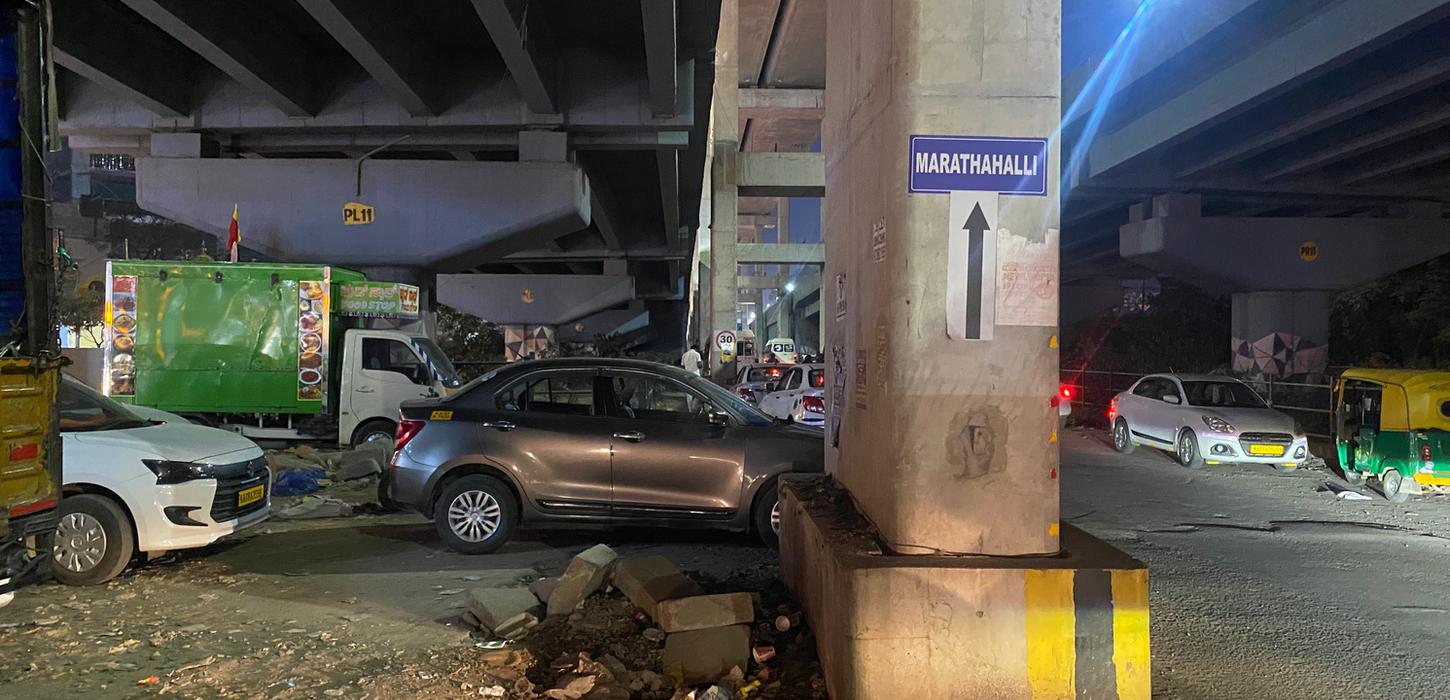 Doddankeundi junction is a busy intersection with significant vehicular, pedestrian, and cycling traffic. The under-flyover space is mostly vacant, with occasional garbage accumulation. Parking available (between Pillar 10-14) in a few segments; a working public toilet; a cabin for pourakarmikas; two disused bus stops; and some landscaped areas. DULT has already created a proposal to redesign the junction, which is yet to be implemented.